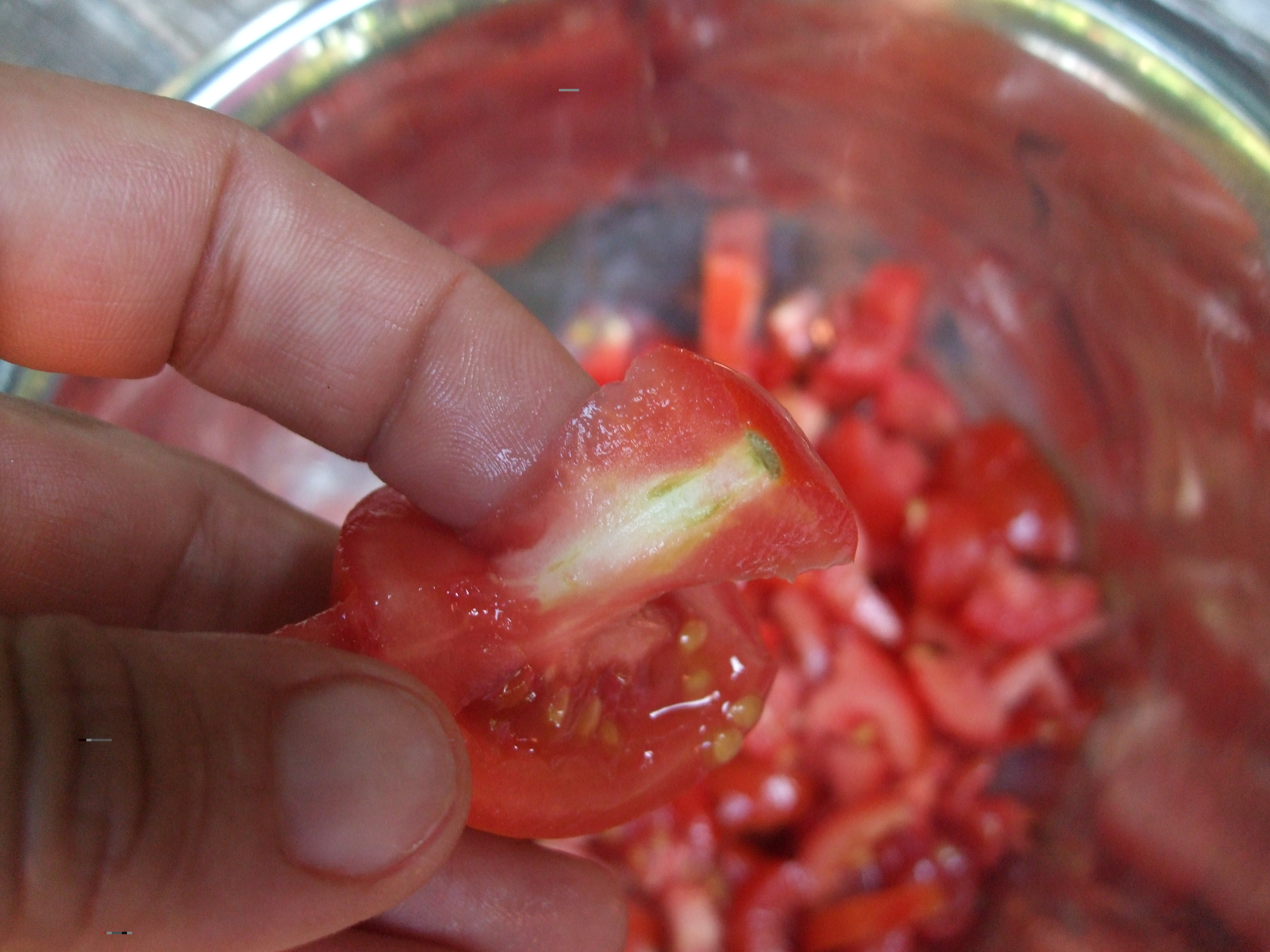 Lava le verdure, togli lo spicchio bianco all’interno dei pomodori e spezzettale grossolanamente