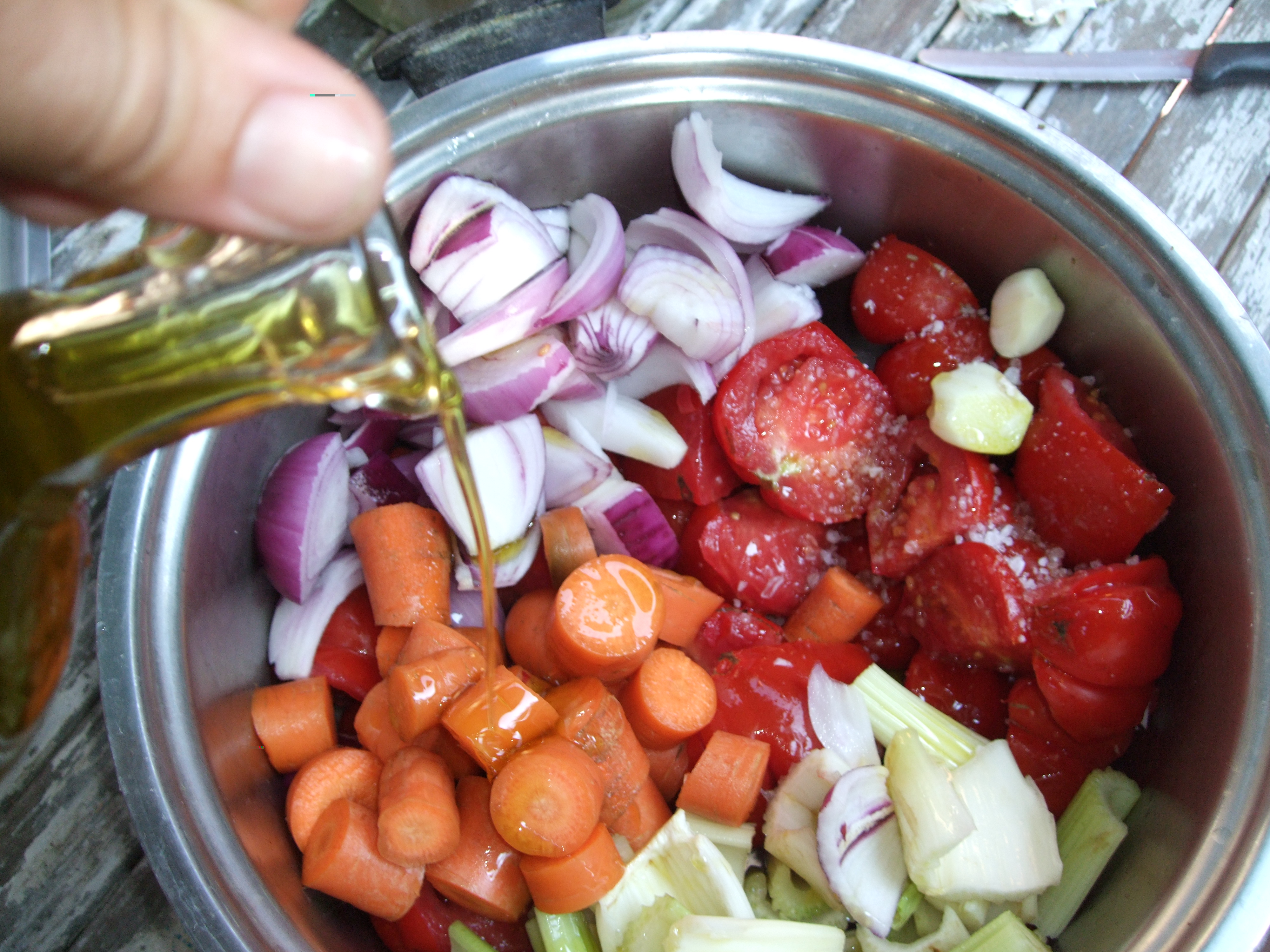 Metti tutti gli ingredienti nel pentolone cuoci per circa 1 ora (quando le carote si schiacciano con la forchetta è pronto).