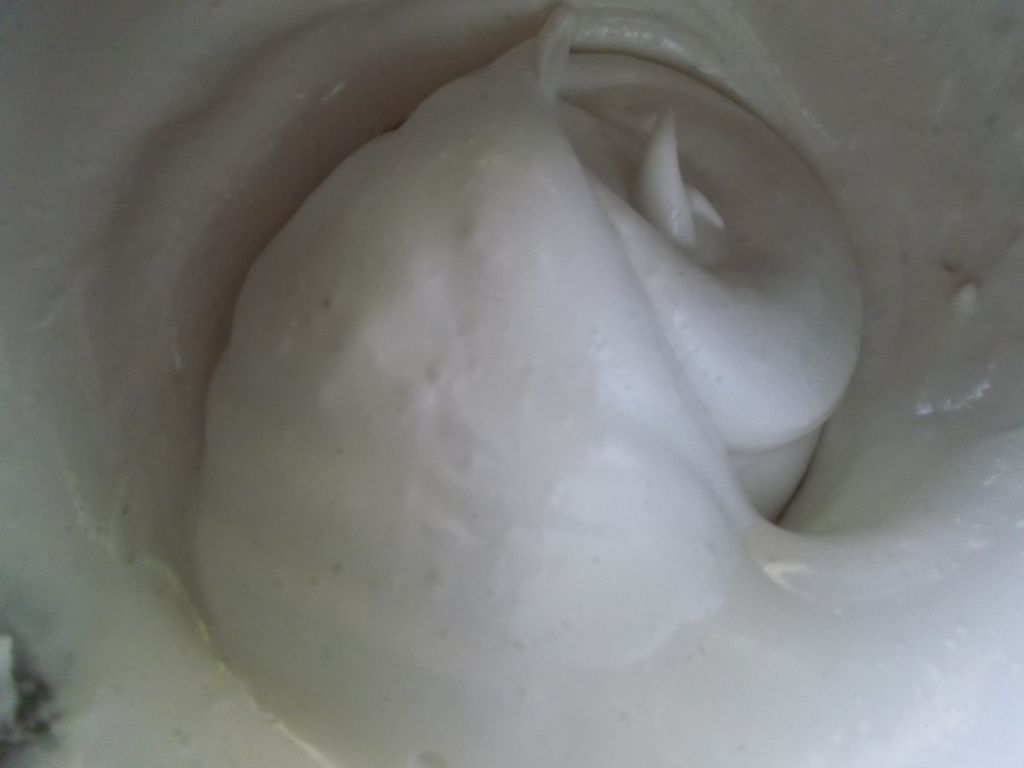 Montare con le fruste i chiari con il pizzico di sale…ed aggiungere piano piano lo zucchero e frullare fino a che diventa solido……