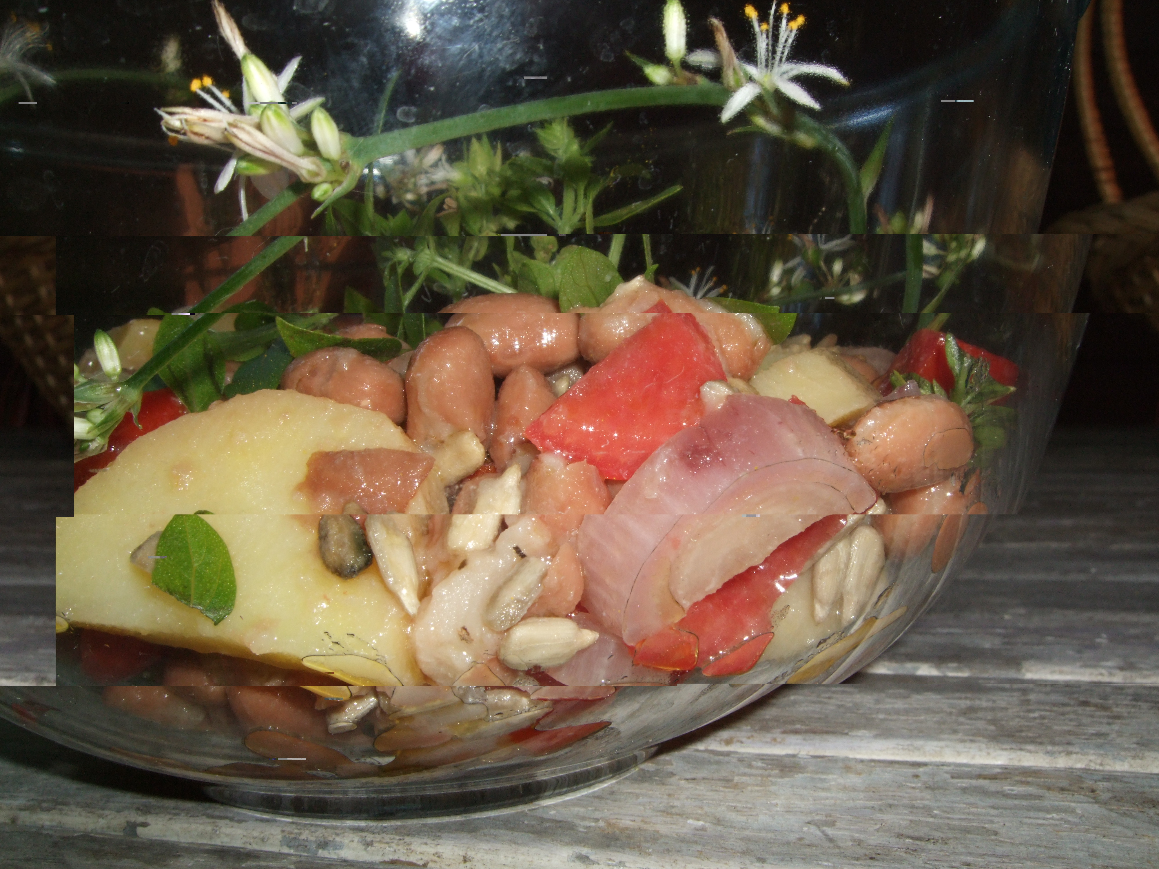 2 patate lesse, 2 cipolle sott’aceto ( o cetriolini ecc.),1 cucchiaio di semi di girasole (o pinoli),2 pomodori, basilico, fagioli lessi, sale pepe ed olio extravergine di oliva.