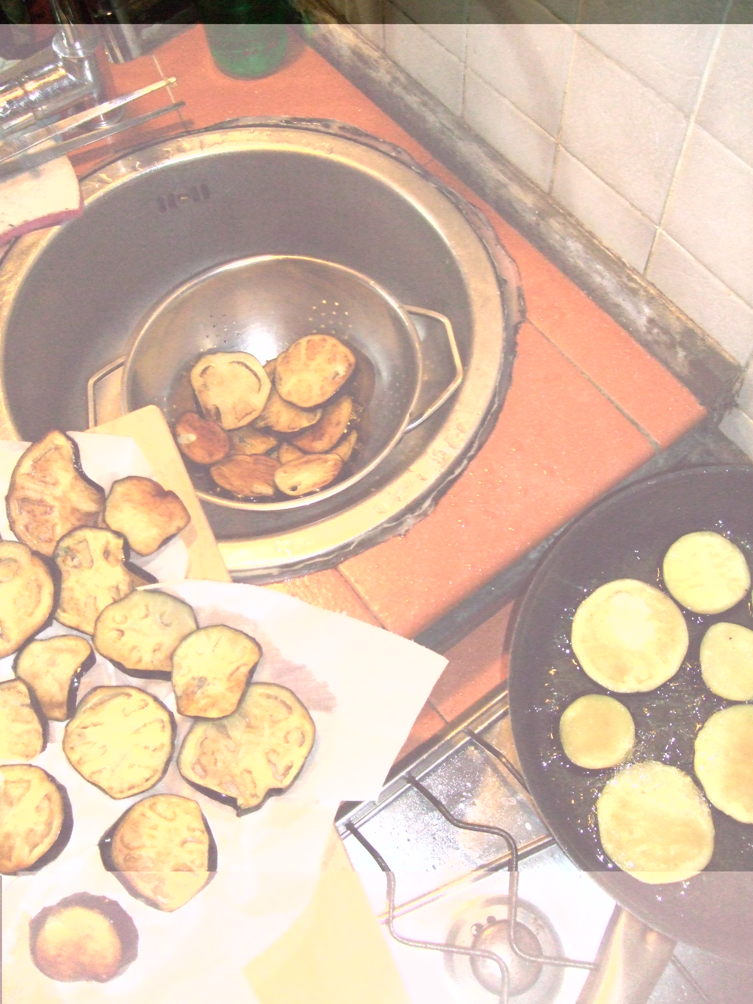 Friggi le melanzane in abbondante olio di semi, non farle scurire troppo, che poi continuano a cuocere anche nell’olio all’aceto, scolale dentro un colino e poi falle freddare su un piatto dove prima hai messo della carta gialla.
