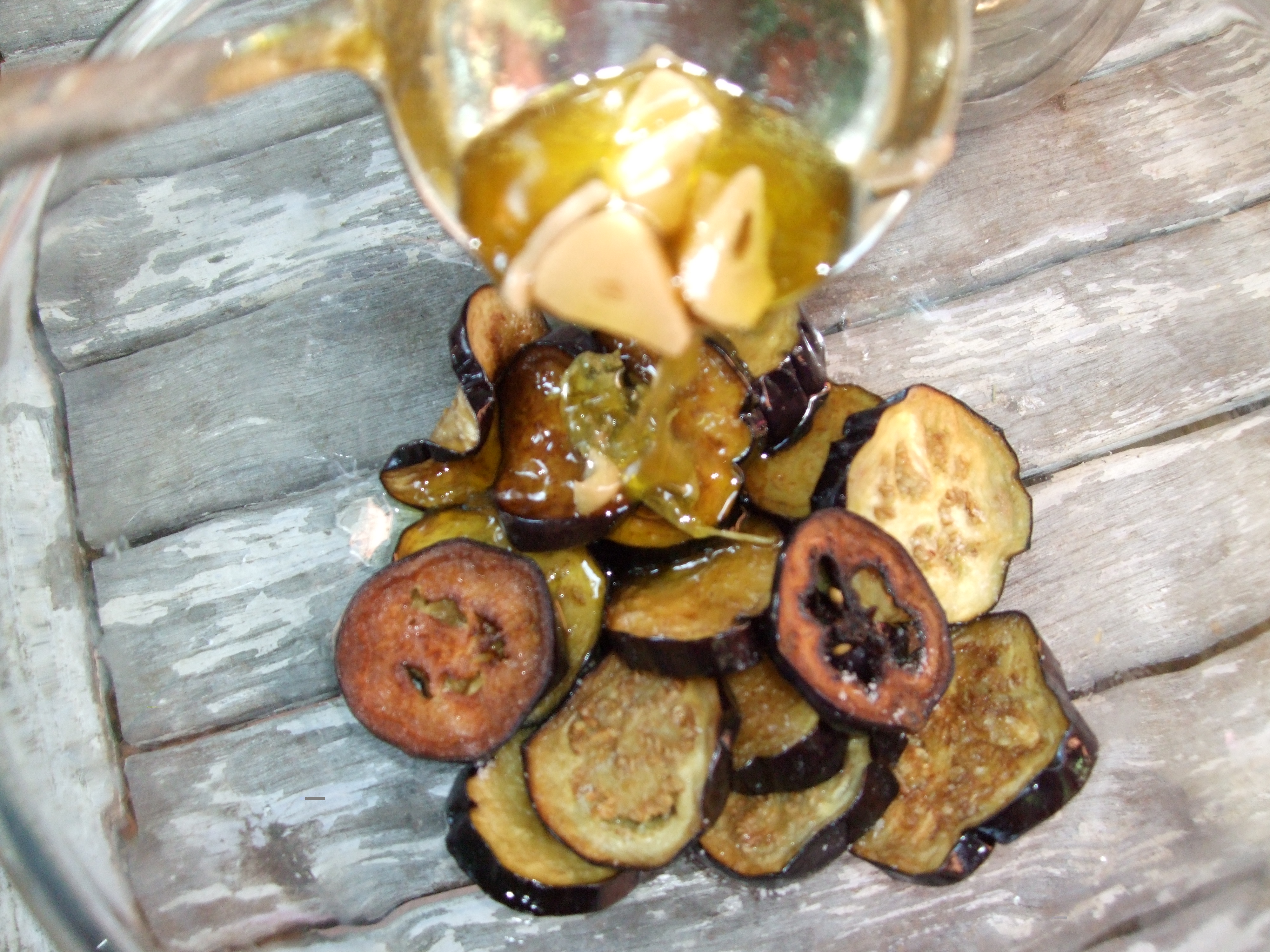 Ora prendi una ciotolina e mettici uno strato di melanzane, un pz di sale, l’olio con l’aceto che hai preparato , poi un altro strato di melanzane ,sale e l’olio fino a che sono finite tutte.