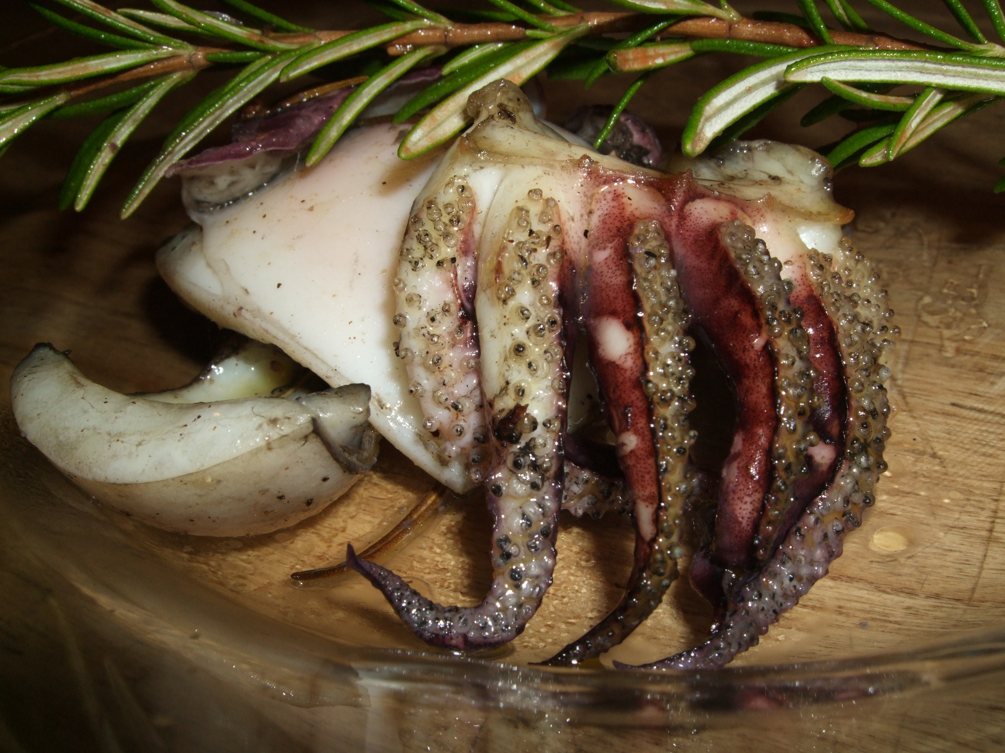 In una teglia metti le seppie con sopra 6 rametti di ramerino e niente altro, e quando il forno ha raggiunto la temperatura, cuocile per 20 minuti circa. Dopo 15 minuti prova con la forchetta , se sono morbide puoi toglierle anche prima di quello che ci ho messo io, può dipendere dal forno o anche dalla grandezza delle seppie.
