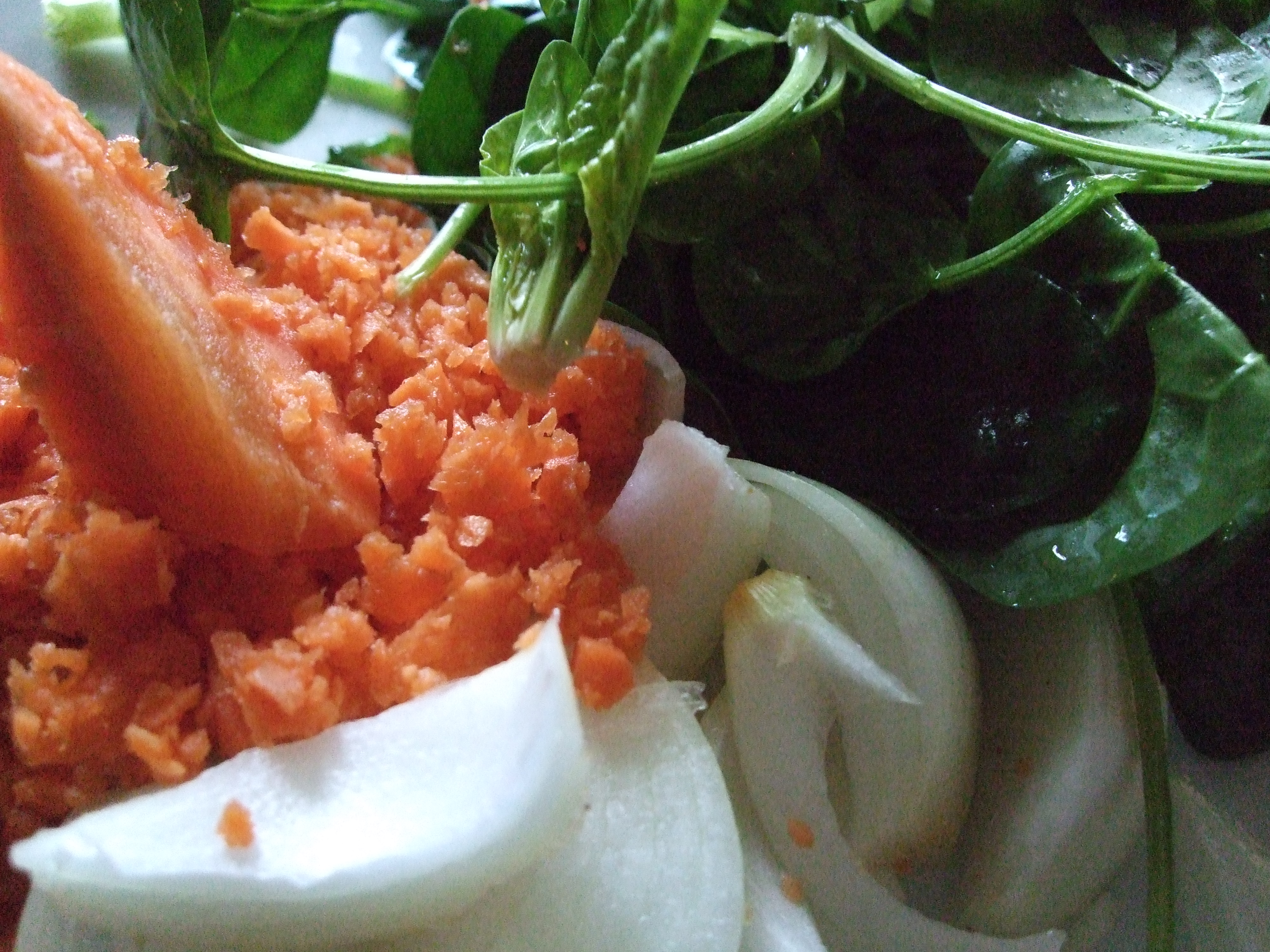 Sminuzza grossolanamente le carote con il frullatore (io ne lascio mezza tagliata a fette perché mi piace trovare qualche pezzettino più grande), taglia le cipolle a fettine e sminuzza li spinaci grossolanamente.