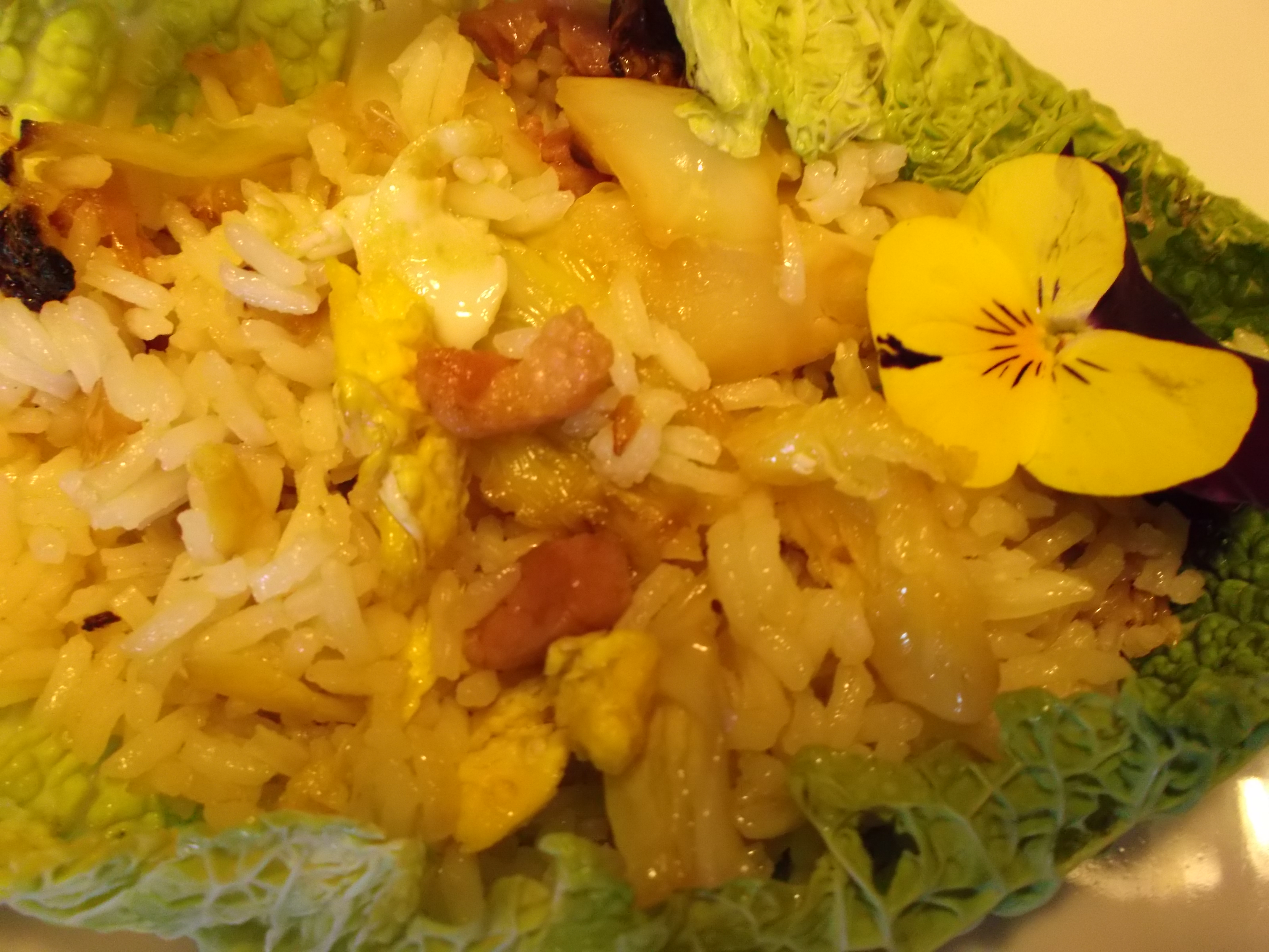 A questo punto mentre il tutto è ancora sul fuoco aggiungi il riso, saltalo bene con il resto del condimento e all’ultimo aggiungi la “mimosa”.