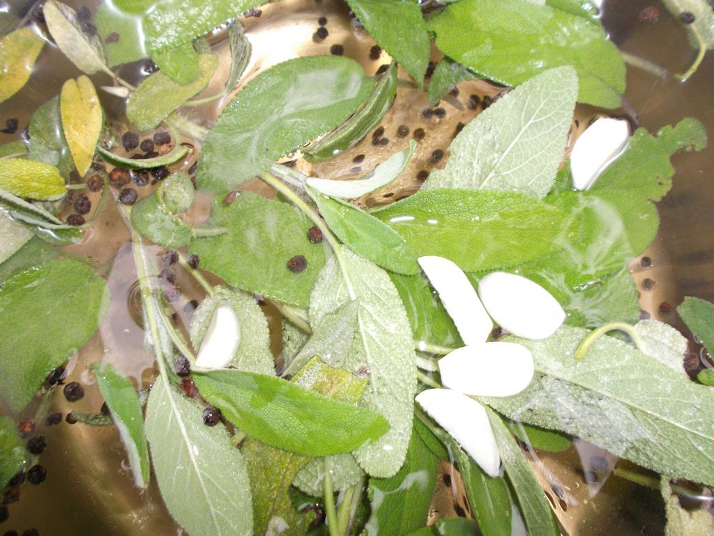 Metti a scaldare in un pentolone l’acqua e l’aceto con la salvia il pepe l’aglio e il sale. Quando l’acqua bolle aggiungi i carciofini, aspetta che l’acqua riprenda il bollor e fai cuocere per 7 minuti. Cola il tutto, e metti ad asciugare su un asciughino di cotone pulito, le foglie di salvia, il pepe l’aglio e i carciofini a testa in giù.