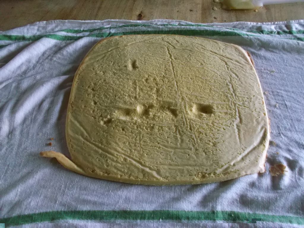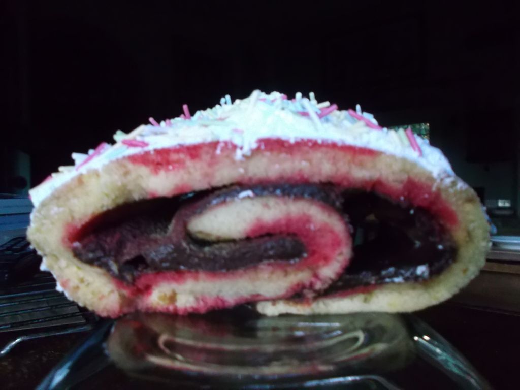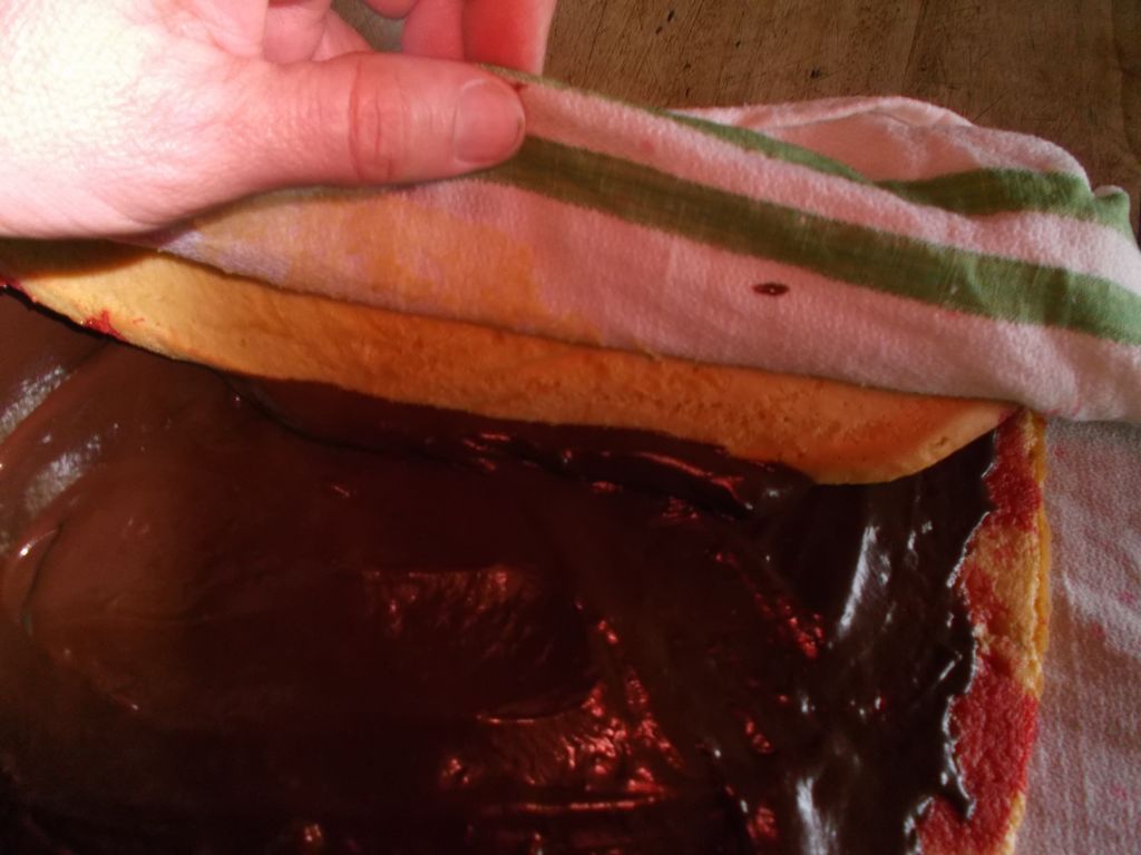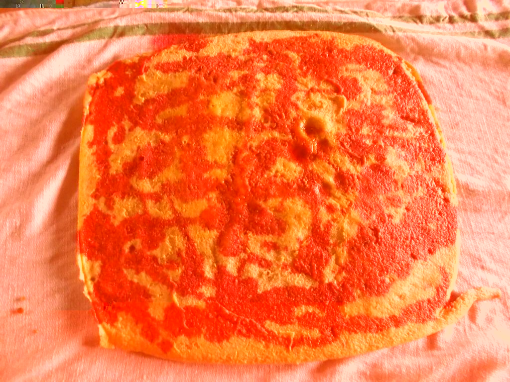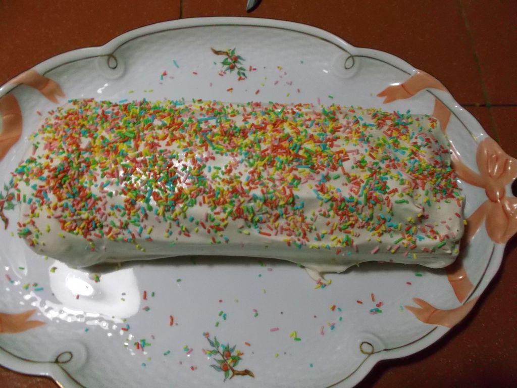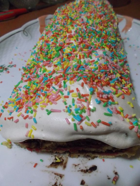 Unisci e mescola per bene il lievito con La farina. In un’altra ciotolina monta le uova con lo zucchero ed il pizzico di sale. Aggiungi la farina con il lievito mentre giri piano, poi il burro e la buccia di arancio. Continua a girare fino a che il composto è completamente amalgamato. Prepara la teglia da forno con sopra la carta forno. Partendo dal centro della teglia versa tutto l’impasto mentre scorri lentamente da un lato all’altro della teglia. Con una spatola stendi l’impasto . Deve essere “alto” circa 0,5 mm. Metti la teglia in forno già caldo a 180° per 10/15 minuti. Togli la teglia con il dolce ed appoggiala su un piano di legno o come credi..ricordati che è calda. Adesso metti un asciughino umido sopra il dolce e rigira la teglia, la parte con l’asciughino in basso il dolce e la teglia in alto .Togli la teglia e la carta da forno . Spruzza sopra l’alchermes, poi metti sopra la cioccolata. Adesso molto delicatamente comincia a rotolare il dolce su se stesso aiutandoti con l’asciughino . Con una spatola spalma sopra la meringa. Poi un bella spolverata di zuccherini colorati… ed è pronto!