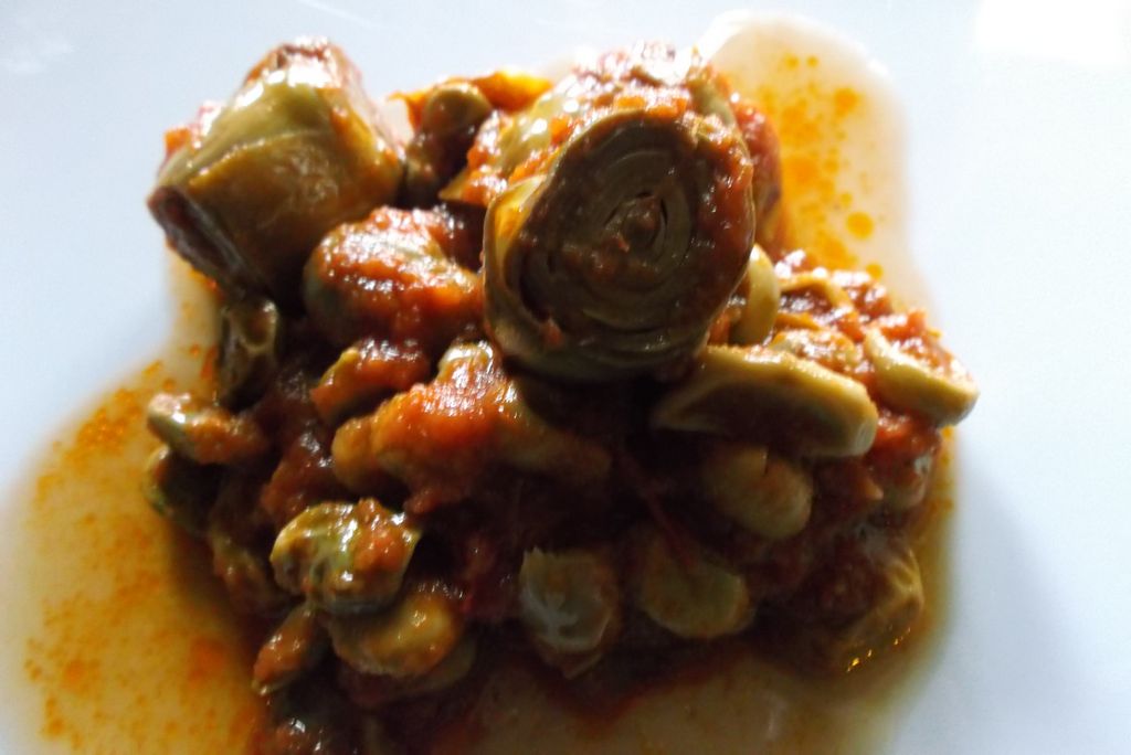 Alza la fiamma, aggiungi i baccelli, fai riprendere il bollore, abbassa di nuovo la fiamma e cuoci per 10 minuti. Aggiungi i carciofini .Fai riprendere il bollore, aggiungi li vino e fai evaporare. Adesso riabbassa la fiamma e cuoci per 30 minuti con il “tappo”.