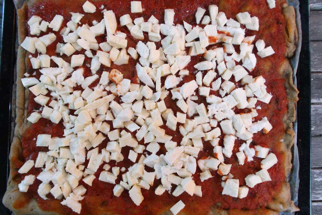 Taglia a dadini la mozzarella e mettila da parte. Prepara la salsa di pomodoro con un pz di sale, 2 cucchiai di olio EVO e l’origano e mettila da parte (non cuocere questa salsina di pomodoro perché cuoce poi insieme alla pizza 🙂 )