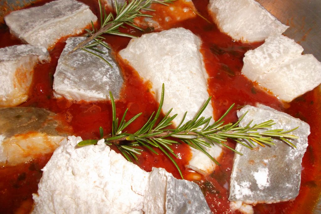 In un ampia padella fai cuocere per 10 minuti la passata di pomodoro, l’aglio,il prezzemolo con l’olio, alza la fiamma,aggiungi il vino e fai sfumare, per 3-4 minuti a fiamma alta. Poi abbassa la fiamma e copri. Lava il baccalà e taglialo a pezzi di circa 5 cm,non togliere la pelle mi raccomando! Passa ogni pezzo nella farina ed adagialo nella padella dove hai preparato il sugo .Aggiungi il ramerino. Cuoci a fuoco medio 5 minuti per lato. Mi raccomando quando lo giri fai molta attenzione perché il baccalà è molto delicato e tende a “sfarsi”. Passato il tempo di cottura, togli il ramerino, togli l’aglio , spengi la fiamma ed e’ pronto!