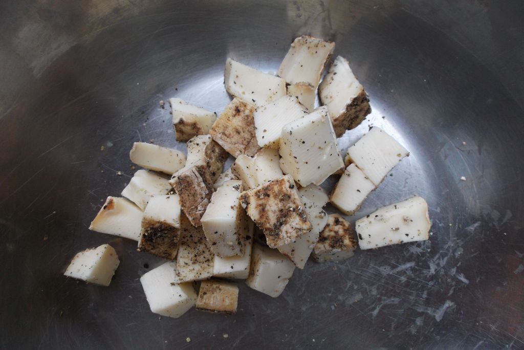 Prepara il taleggio: taglialo a tocchetti e passalo in una bella grattata di pepe appena macinato.