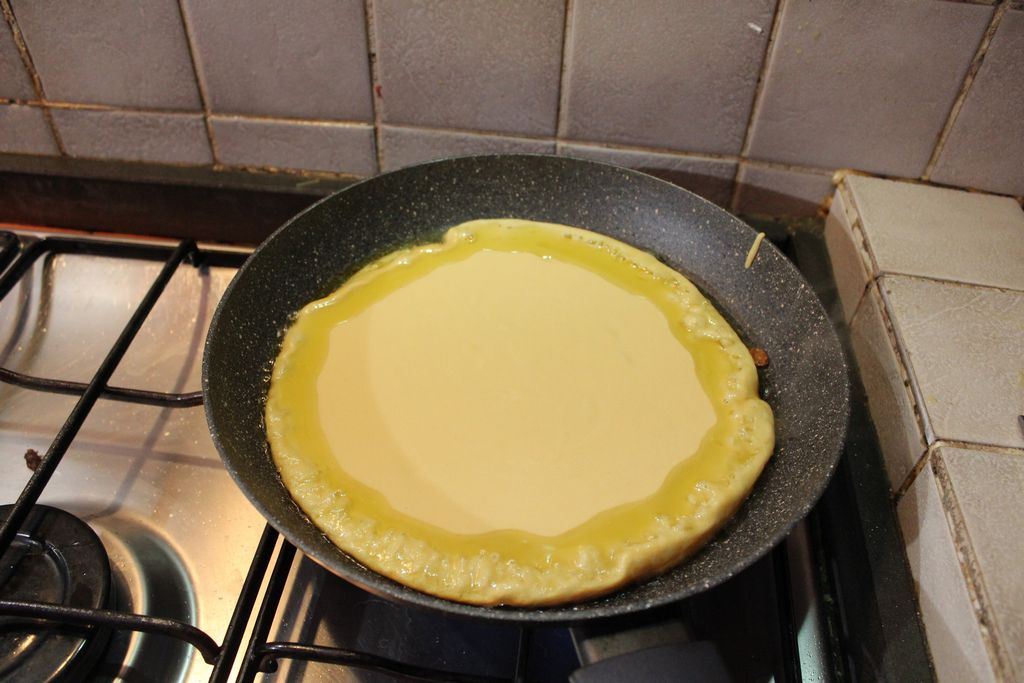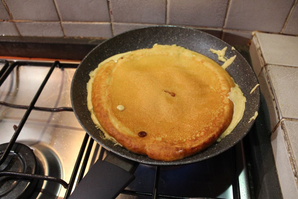 Scalda un filo d’olio in una padella antiaderente, poi versa l’impasto e cuoci come una frittata, fino a quando è ben dorata sotto. Girala con delicatezza e termina la cottura anche dall’altro lato.