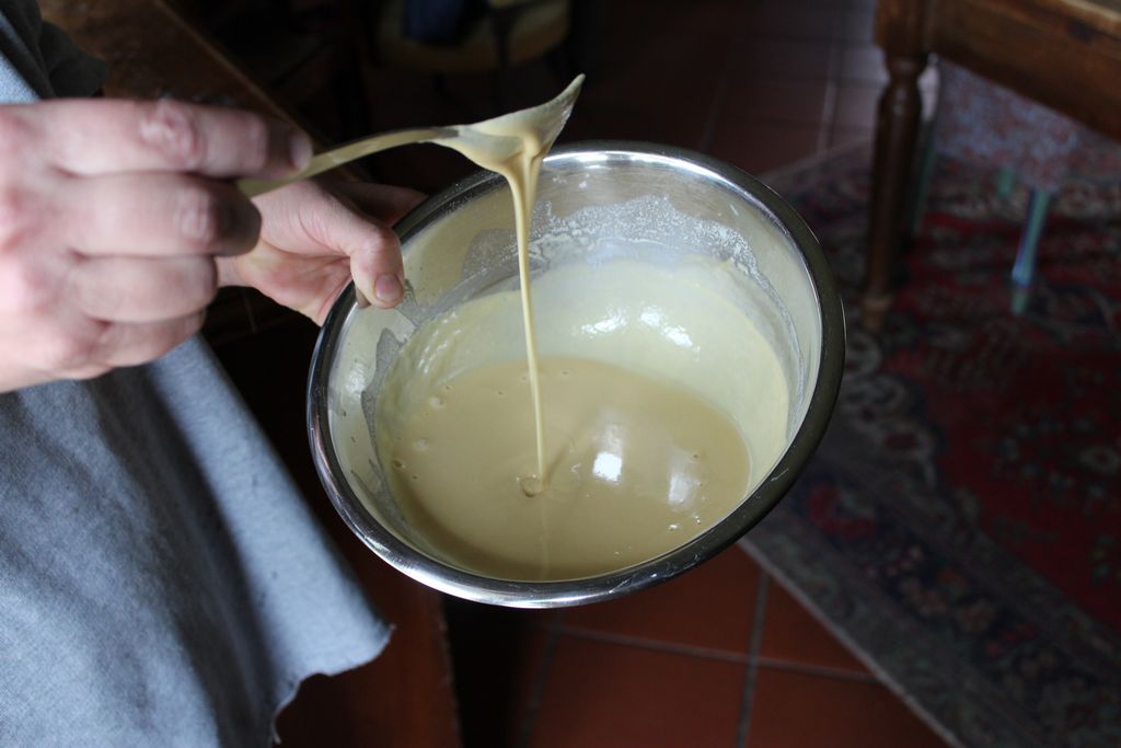 Unisci l’acqua poco alla volta, mescolando bene, facendo attenzione a non formare grumi. L’impasto deve risultare cremoso.