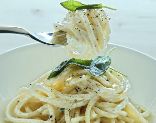 Scola la pasta al dente, conservando un po’ di acqua di cottura, e mantecala nel burro profumato alla salvia.